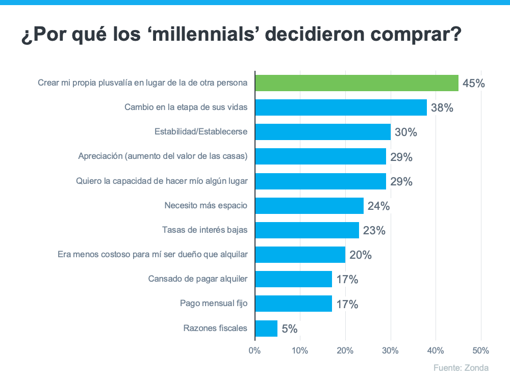 En los Estados Unidos, hay más de 72 millones de ‘millennials’. Si usted es parte de esta generación y ha pensado en comprar una casa, no está solo. Según Zonda, el 98 % de los ‘millennials’ quieren convertirse en propietarios de una casa en algún momento si aún no lo son. ¿Pero por qué? Hay muchas razones por las que pueden optar por convertirse en propietarios. He aquí por qué otros ‘millennials’ han tomado esa decisión (vea la gráfica a continuación):