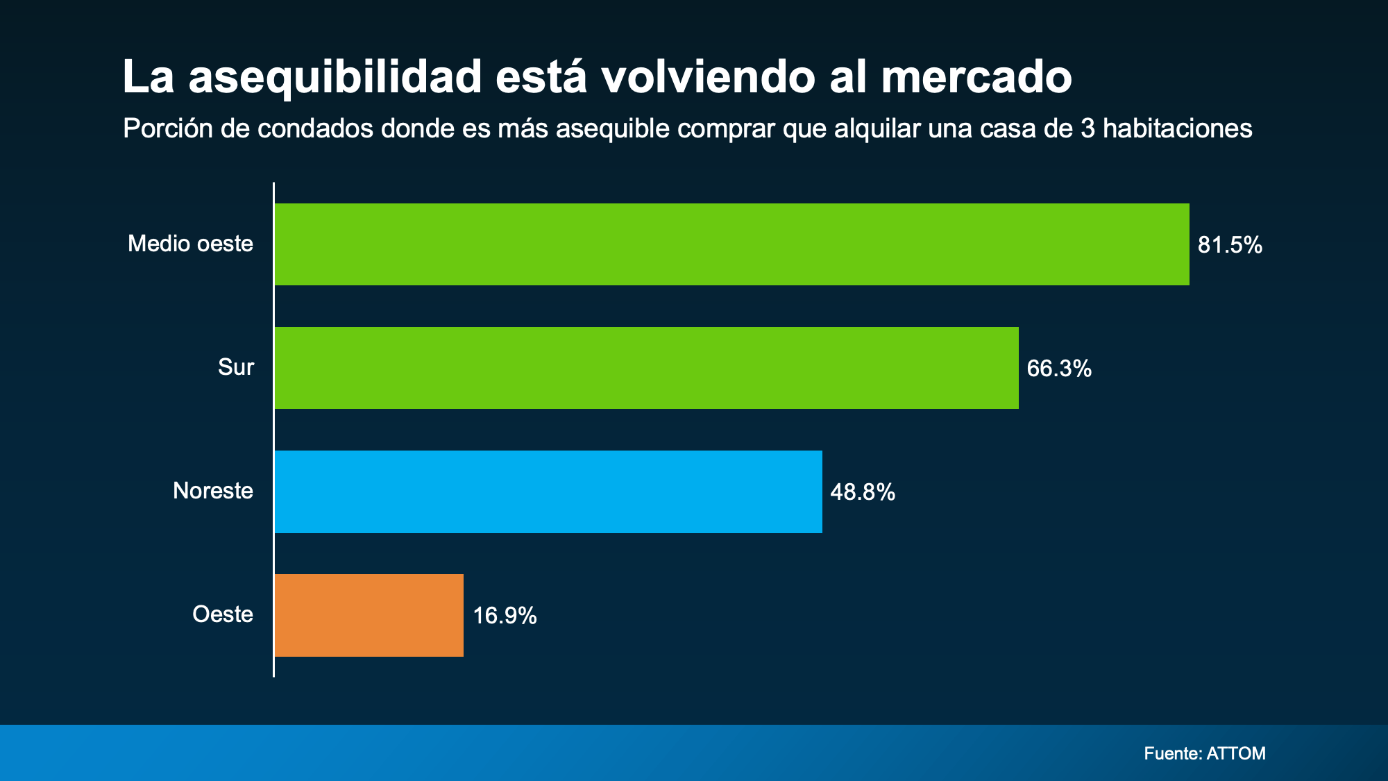 Aunque comprar es más asequible que alquilar en casi el 58 % de los condados del país, esa porción varía según la región (ver la gráfica abajo):