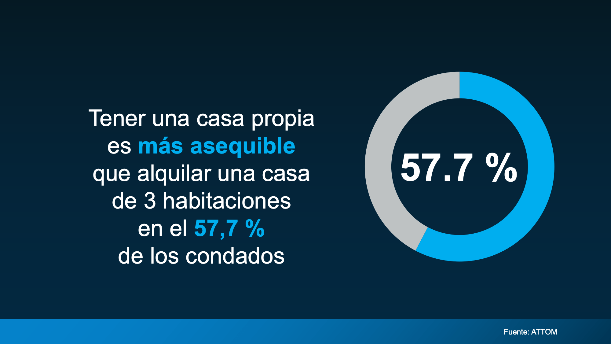 Hoy en día, tener una casa en propiedad cuesta menos cada mes que alquilar una casa de 3 habitaciones. Y los datos recientes de ATTOM muestran que eso es cierto en casi el 58 % de los condados de los Estados Unidos. (ver la gráfica más abajo).