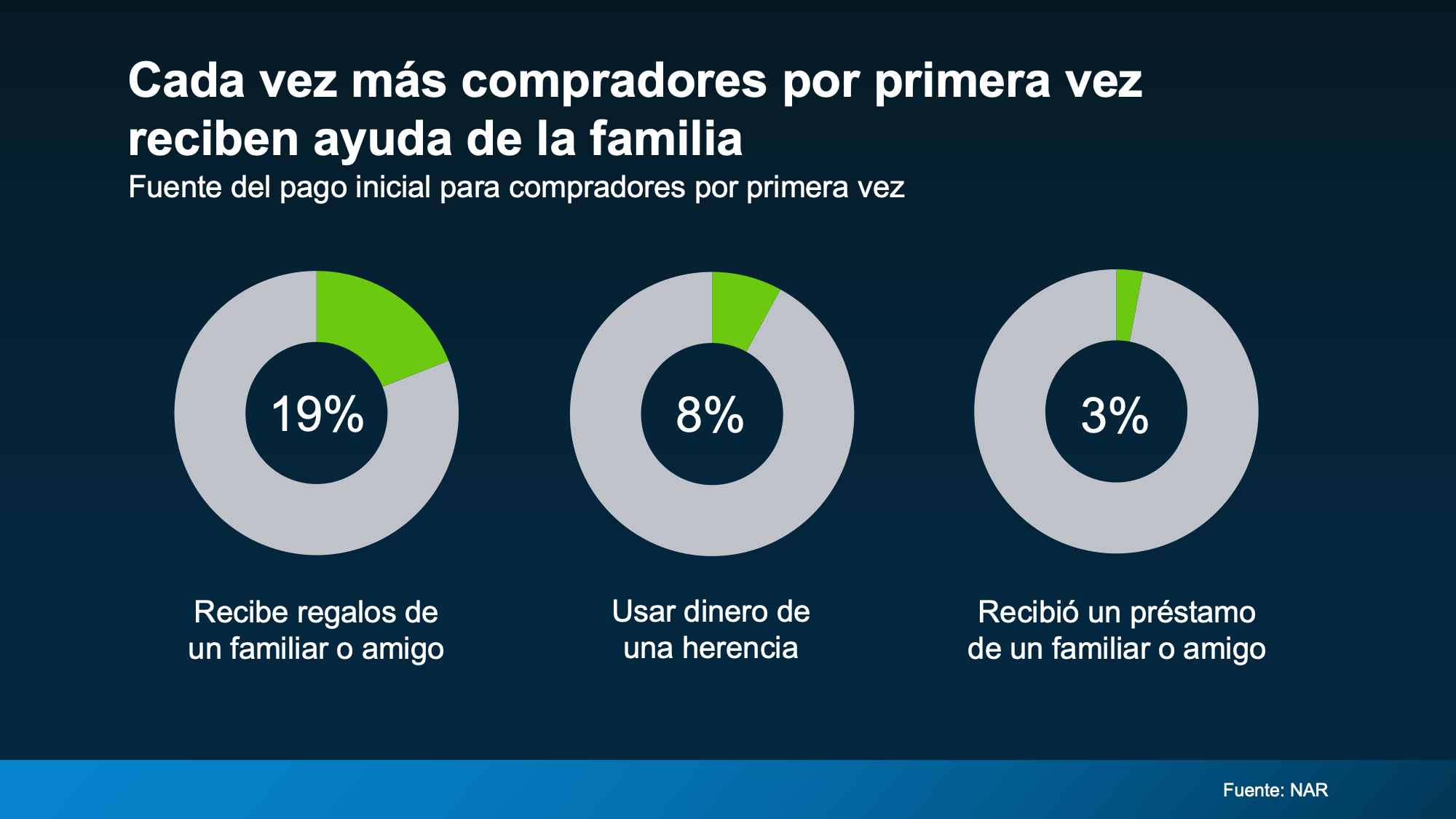 Cada vez más compradores jóvenes utilizan regalos y préstamos de sus seres queridos como trampolín hacia la propiedad de una casa. Según la Asociación Nacional de Realtors (NAR, por sus siglas en inglés), casi 1 de cada 5 compradores por primera vez utiliza un regalo en efectivo de su familia o seres queridos como pago inicial.