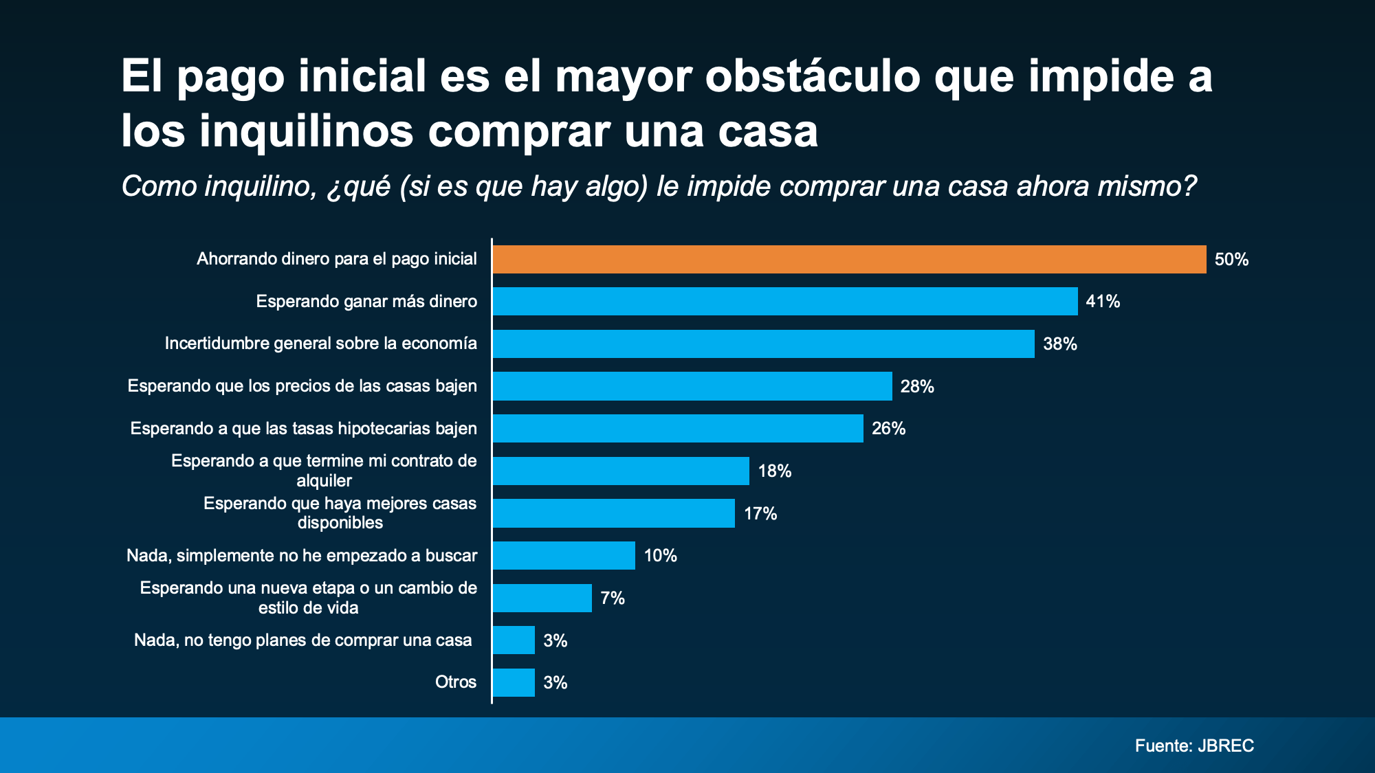 Cuando John Burns Research & Consulting (JBREC) preguntó a los inquilinos qué les impide comprar, la respuesta principal no fue las tasas hipotecarias ni los precios de las casas. Era el costo inicial, especialmente ahorrar lo suficiente para el pago inicial (vea la gráfica siguiente):