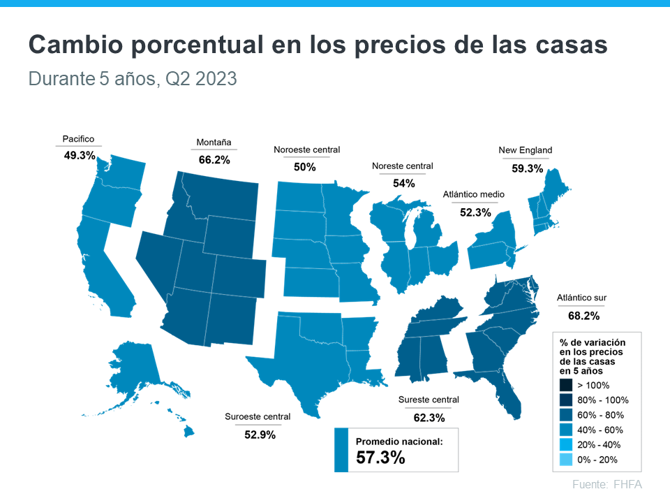 El mapa siguiente utiliza datos de la Agencia Federal de Financiamiento de la Vivienda (FHFA por sus siglas en inglés) para mostrar cuán notables han sido las ganancias de los precios en los últimos cinco años. Y, dado que los precios de las casas varían según el área, el mapa se desglosa regionalmente para ayudar a transmitir tendencias de mercado más grandes: