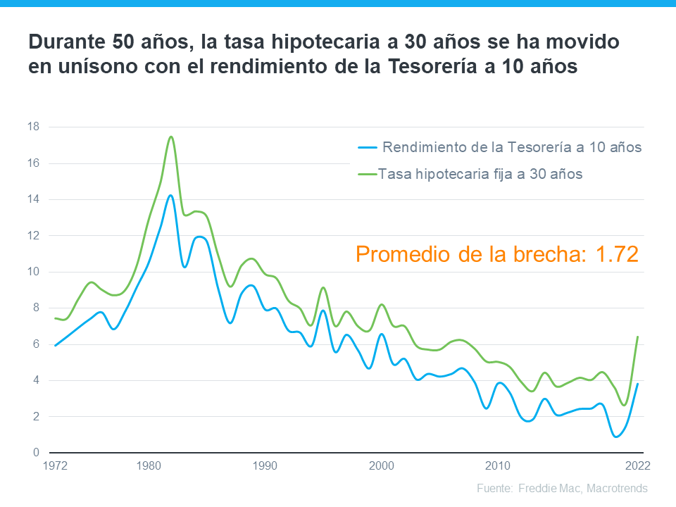 Pero, hay una cosa que históricamente es un buen indicador de lo que sucederá con las tasas, y esa es la relación entre la tasa hipotecaria a 30 años y el rendimiento de la Tesorería a 10 años. Aquí hay una gráfica que muestra esas dos métricas desde que Freddie Mac comenzó a mantener registros de las tasas hipotecarias en 1972: