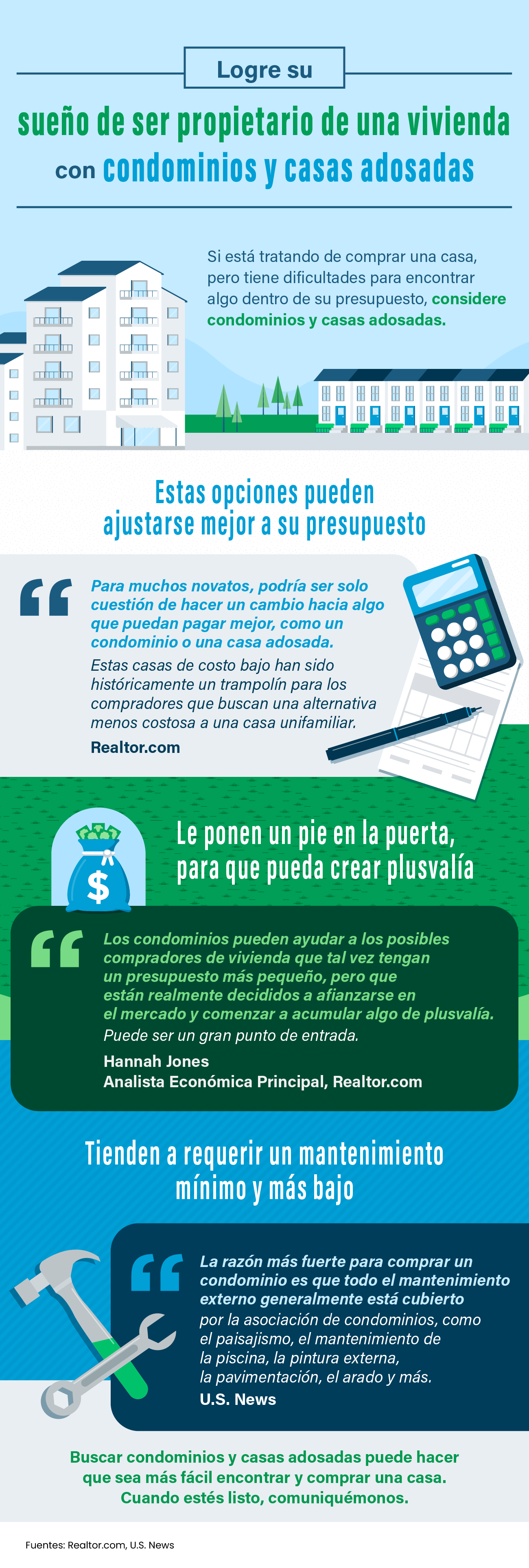 • Si está tratando de comprar una casa pero tiene dificultades para encontrar algo que este dentro de su presupuesto, aquí hay algo que puede ayudarle: considere condominios y casas adosadas.