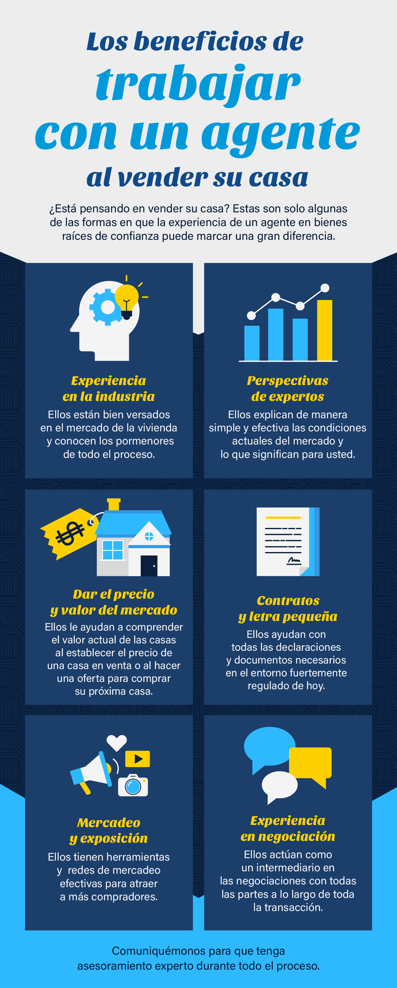 - Ellos le explicarán lo que está sucediendo hoy, lo que eso significa para usted y cómo fijar el precio y promocionar su casa. También son hábiles negociadores y están bien versados en los contratos y las declaraciones involucradas.