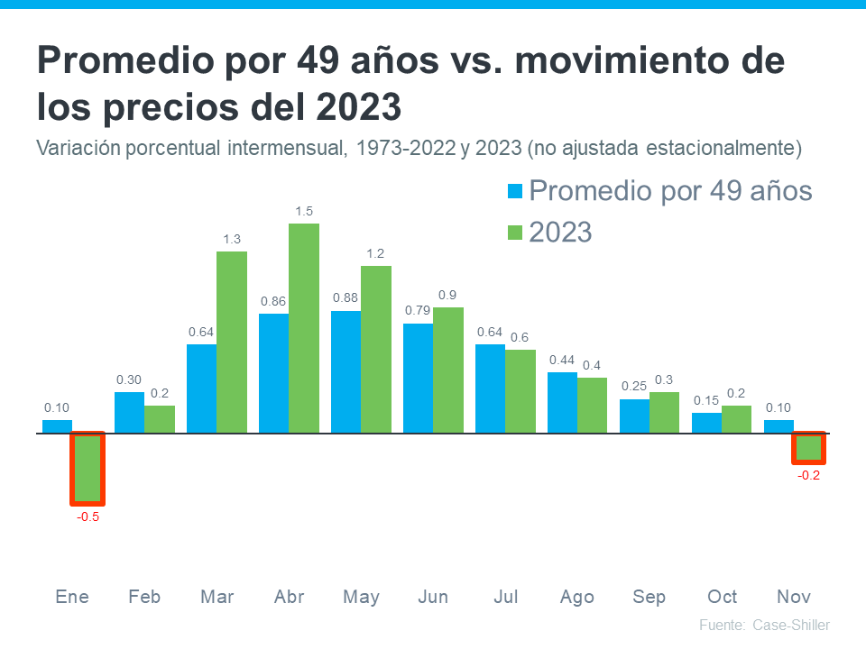 Como muestran los datos, durante casi 50 años, los precios de las casas coinciden con la estacionalidad típica del mercado. A principios de año, los precios de las casas aumentan de forma más moderada. Esto se debe a que el mercado está menos activo, ya que menos personas se mueven en enero y febrero. Entonces, a medida que el mercado pasa a la temporada alta de compra de casas en la primavera, la actividad aumenta. Eso significa que los precios de las casas también lo hacen. Luego, a medida que se acercan el otoño y el invierno, la actividad vuelve a disminuir y los precios aumentan, solo que a un ritmo más lento.