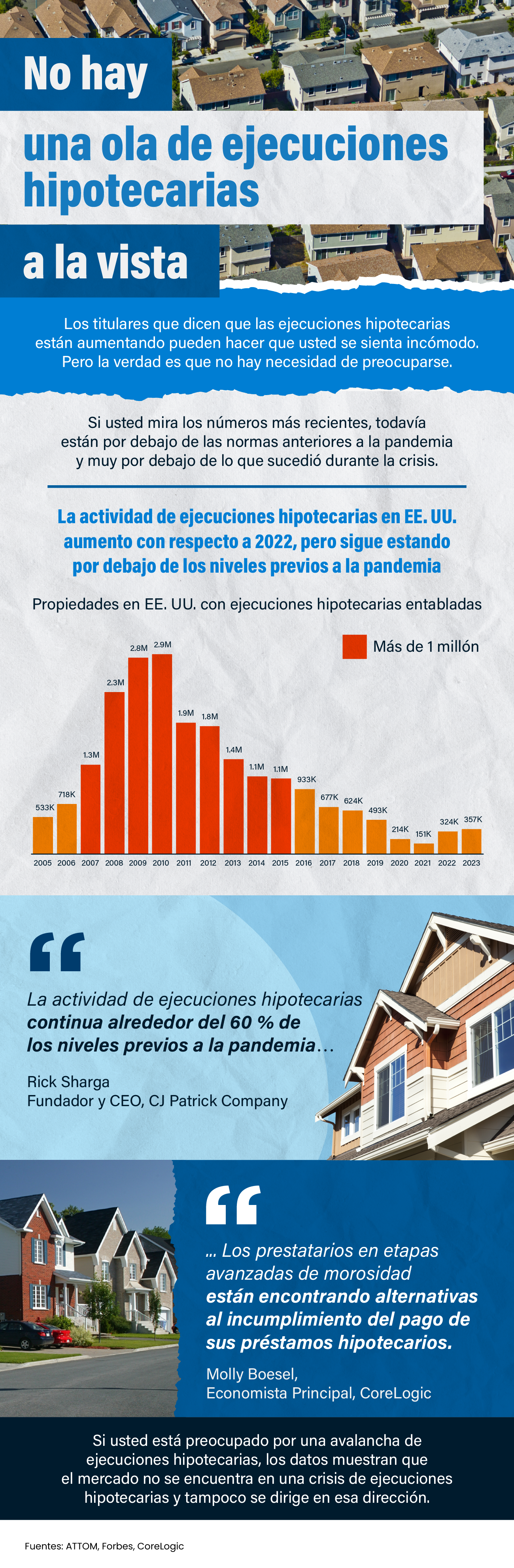 - Si usted está preocupado por una avalancha de ejecuciones hipotecarias, los datos muestran que el mercado no se encuentra en una crisis de ejecuciones hipotecarias actualmente y tampoco se dirige en esa dirección.