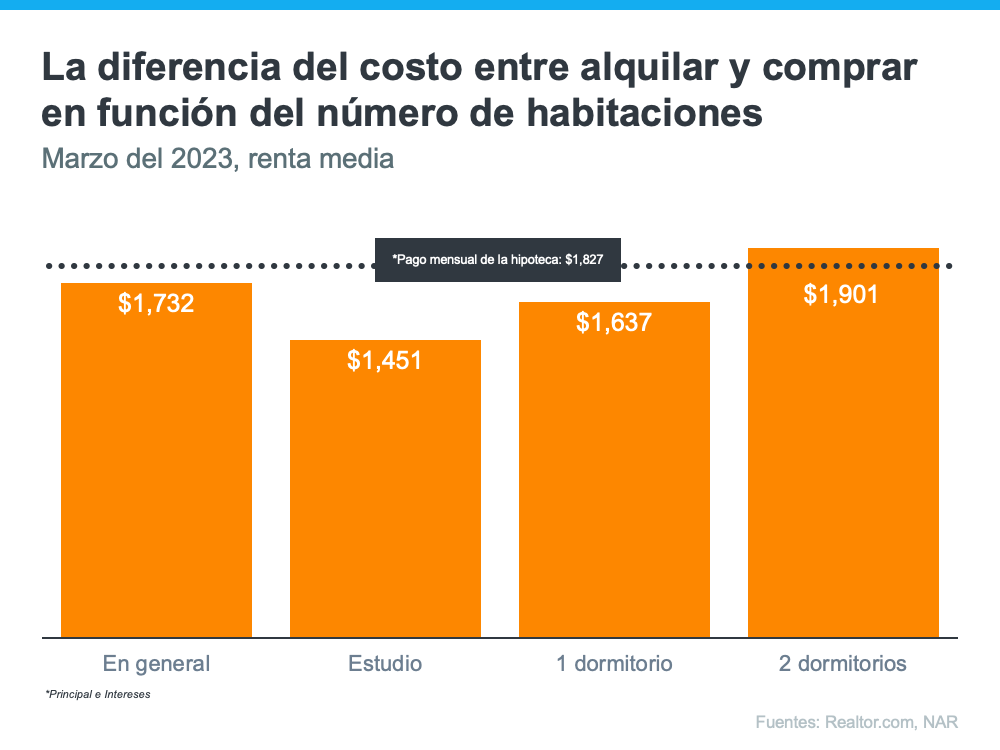 La siguiente gráfica utiliza datos nacionales sobre el pago medio del alquiler de Realtor.com y el pago hipotecario medio de la Asociación Nacional de Realtors (NAR, por sus siglas en inglés)  para comparar las dos opciones. Como muestra la gráfica, dependiendo de cuánto espacio necesite, generalmente es más asequible poseer que alquilar si necesita dos o más habitaciones:
