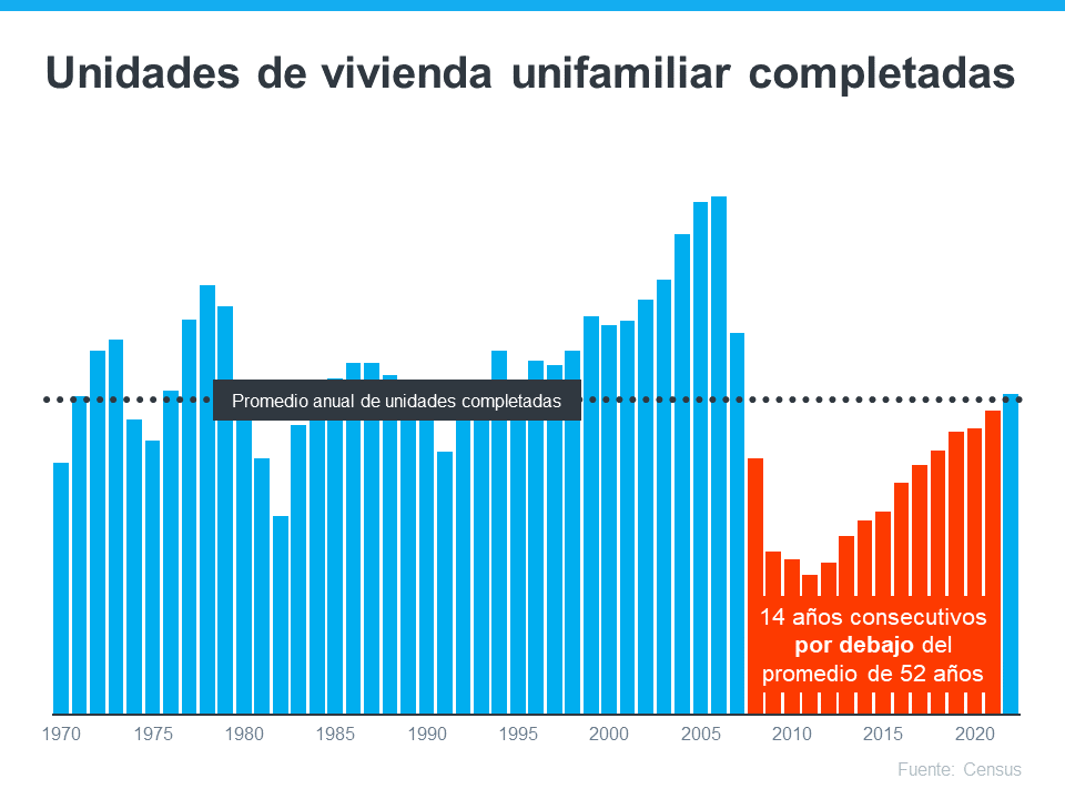 Los 14 años de subconstrucción (se muestran en rojo) son una gran parte de la razón por la cual el inventario es tan bajo hoy en día. Básicamente, los constructores no han estado construyendo suficientes casas durante años y eso ha creado un déficit significativo en la oferta.