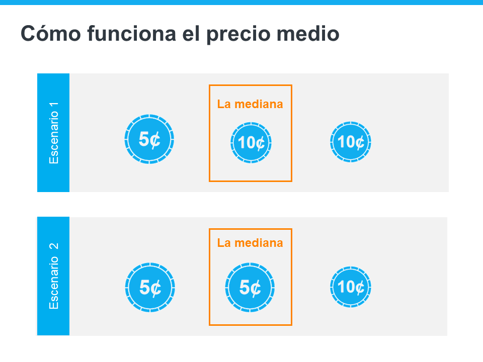Para enfatizar este punto, aquí hay una explicación simple del valor medio (ver la imagen a continuación). Digamos que tiene tres monedas en su bolsillo y decide alinearlas de acuerdo con su valor de menor a mayor. Si tiene un níquel y dos monedas de diez centavos, el valor medio (la mediana) es de 10 centavos. Si tiene dos monedas de cinco centavos y una moneda de diez centavos, el valor medio ahora es de cinco centavos.