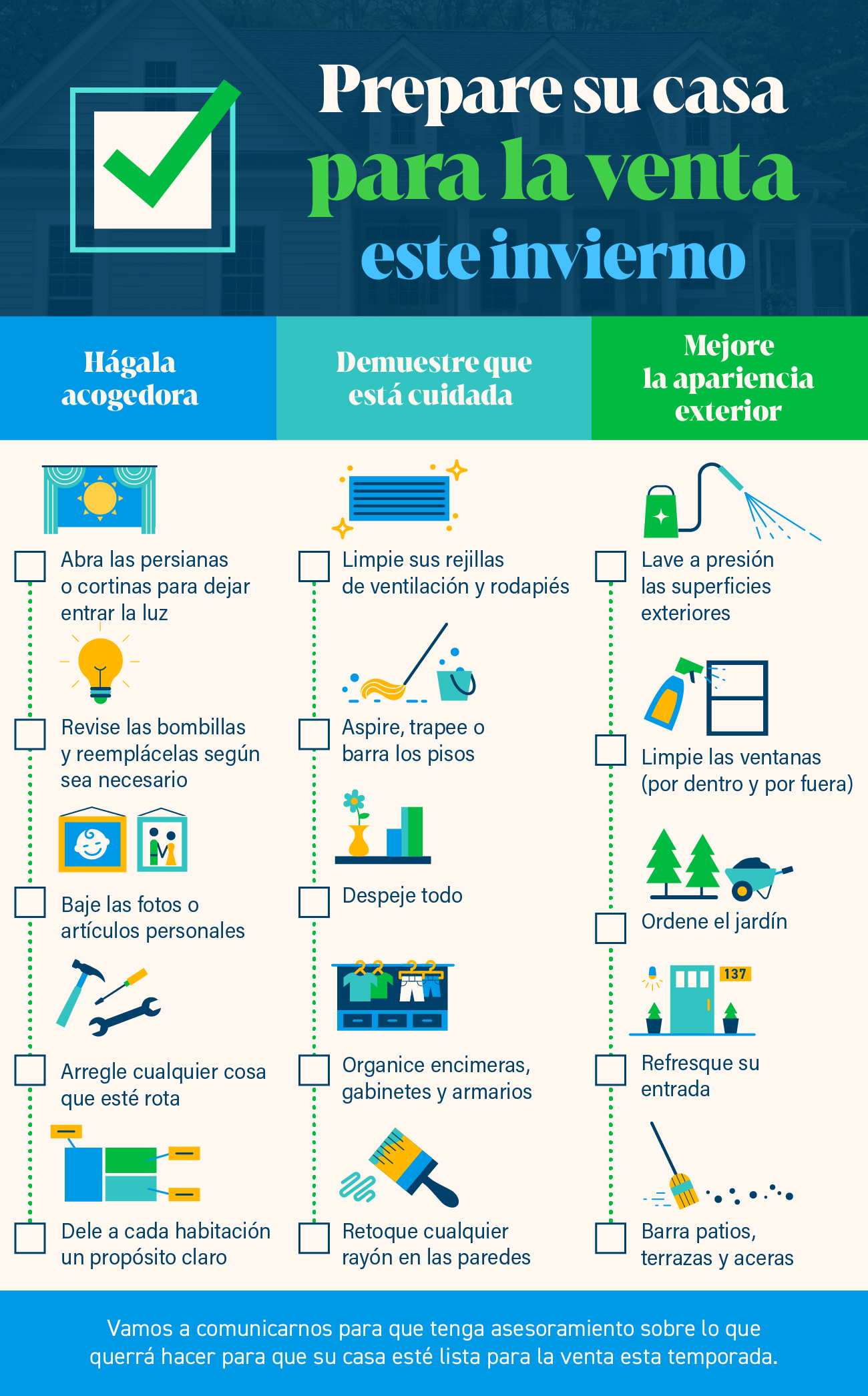 - Comuniquémonos para que tengas consejos sobre qué más puede querer hacer para que su casa esté lista para la venta esta temporada.