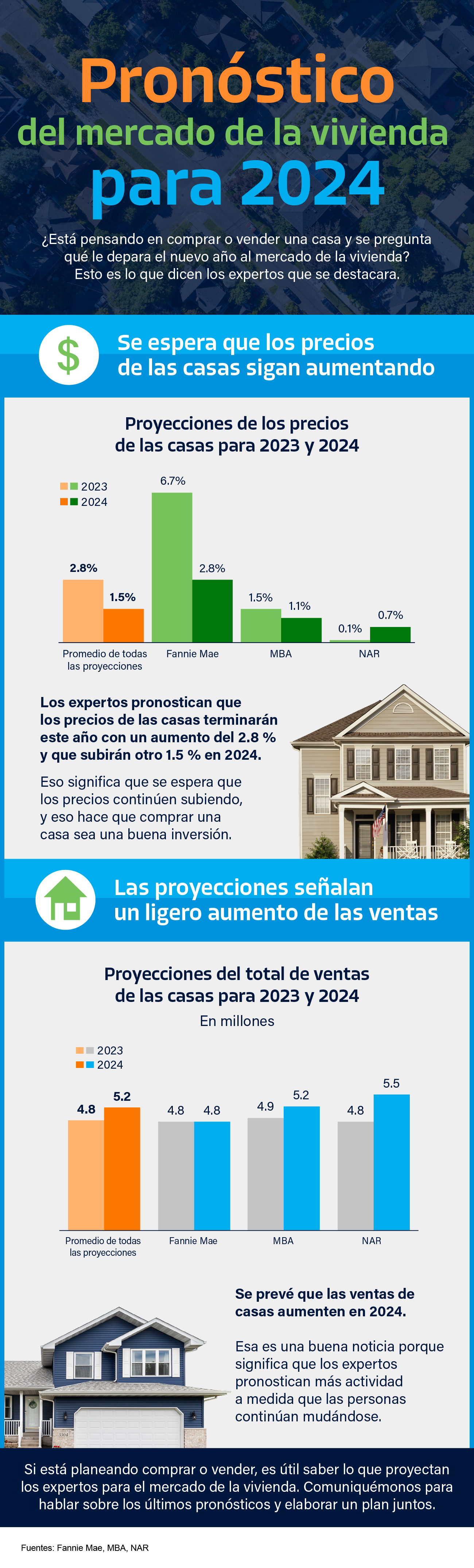 - Además, se prevé que las ventas de las casas aumenten en 2024. Esa es una buena noticia porque significa que los expertos pronostican más actividad a medida que las personas continúan mudándose.