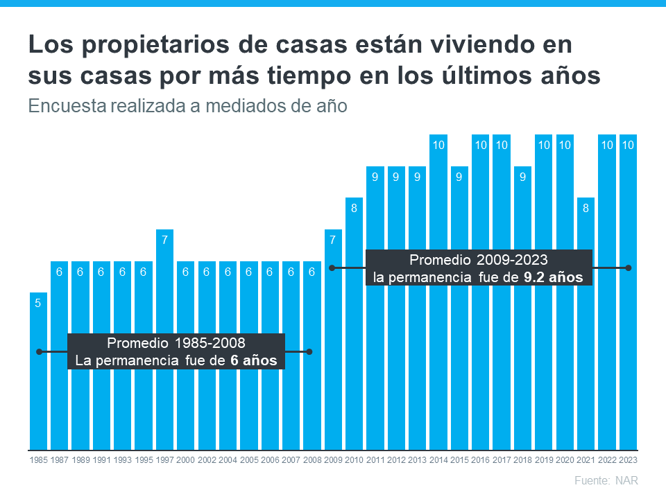 De 1985 a 2008, el tiempo promedio que los propietarios solían permanecer en sus casas era de solo seis años. Pero según la Asociación Nacional de Realtors (NAR, por sus siglas en inglés), ese número está aumentando hoy, lo que significa que muchos propietarios viven en sus casas aún más tiempo (vea la gráfica a continuación):