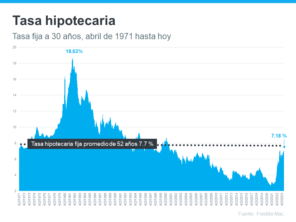 Freddie Mac ha estado rastreando la tasa hipotecaria fija a 30 años desde abril de 1971. Cada semana, publican los resultados de su Encuesta del Mercado Hipotecario Primario, que promedia los datos de las solicitudes de hipotecas de los prestamistas de todo el país (vea la gráfica a continuación):