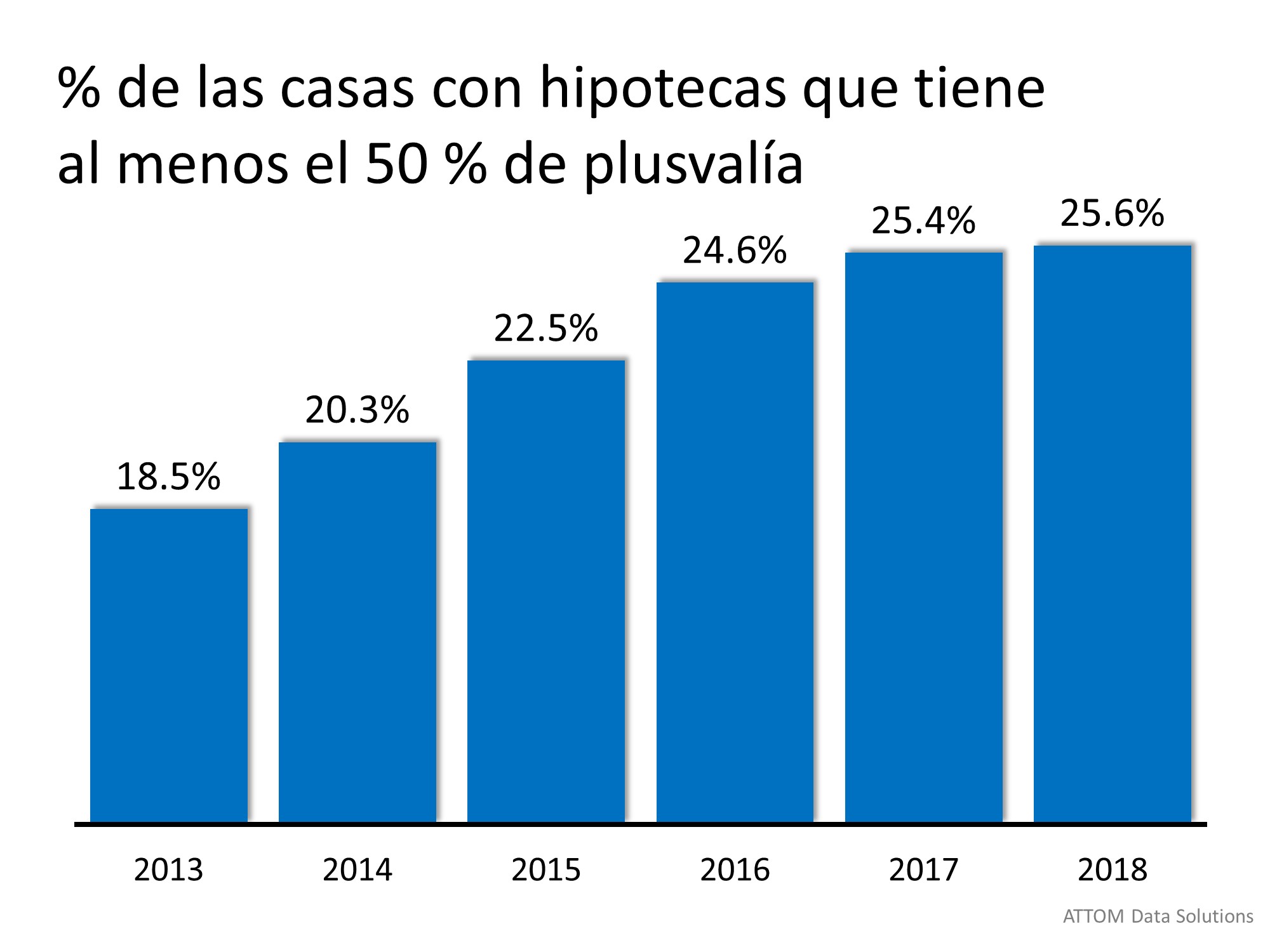 El número de propietarios que actualmente tienen al menos el 50 % de plusvalía en sus casas es asombroso. Según el Urban Institute, 37.1 % de todas las viviendas en el país están libres de hipotecas. En un estudio de plusvalía de la vivienda, ATTOM Data Solutions reveló que del 62.9 % de las casas con una hipoteca, 25.6 % tiene al menos el 50 % de plusvalía. Ese número ha ido en aumento en los últimos cinco años.