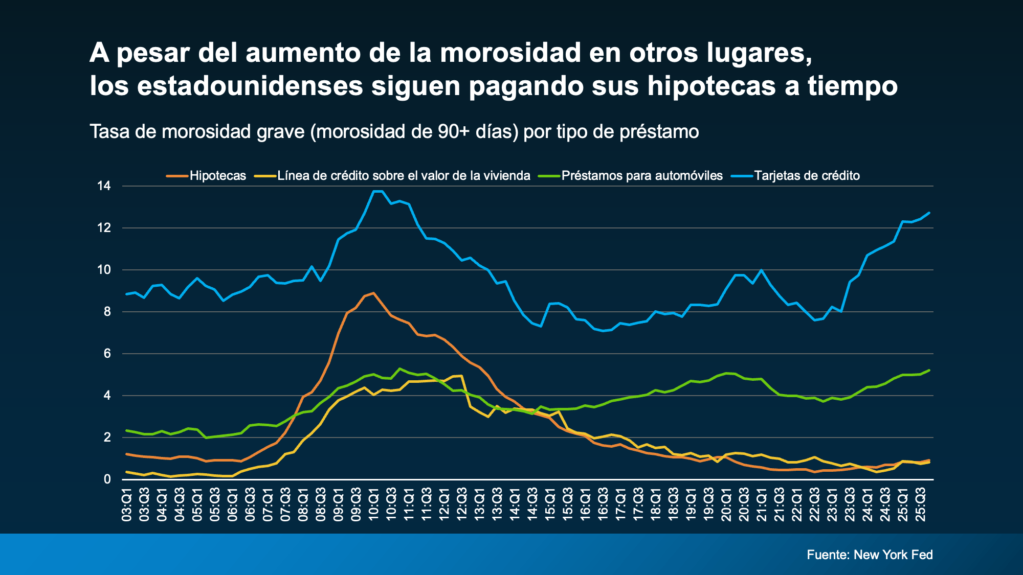 En otras palabras, la gente puede atrasarse con otras deudas, pero lucha con fuerza por mantener su vivienda. Y, en el mercado actual de la vivienda, también están en una posición sólida de plusvalía para hacerlo.
