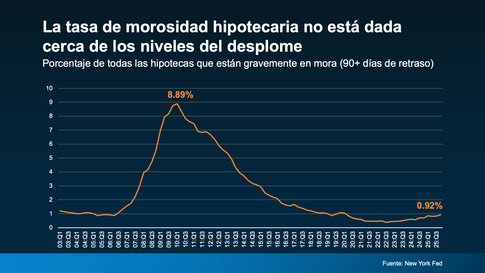 Actualmente, alrededor del 1 % de las hipotecas están gravemente morosas. Eso es solo 1 de cada 100. En los años alrededor del desplome, subieron alrededor del 9 %. Eso es 1 de cada 11.